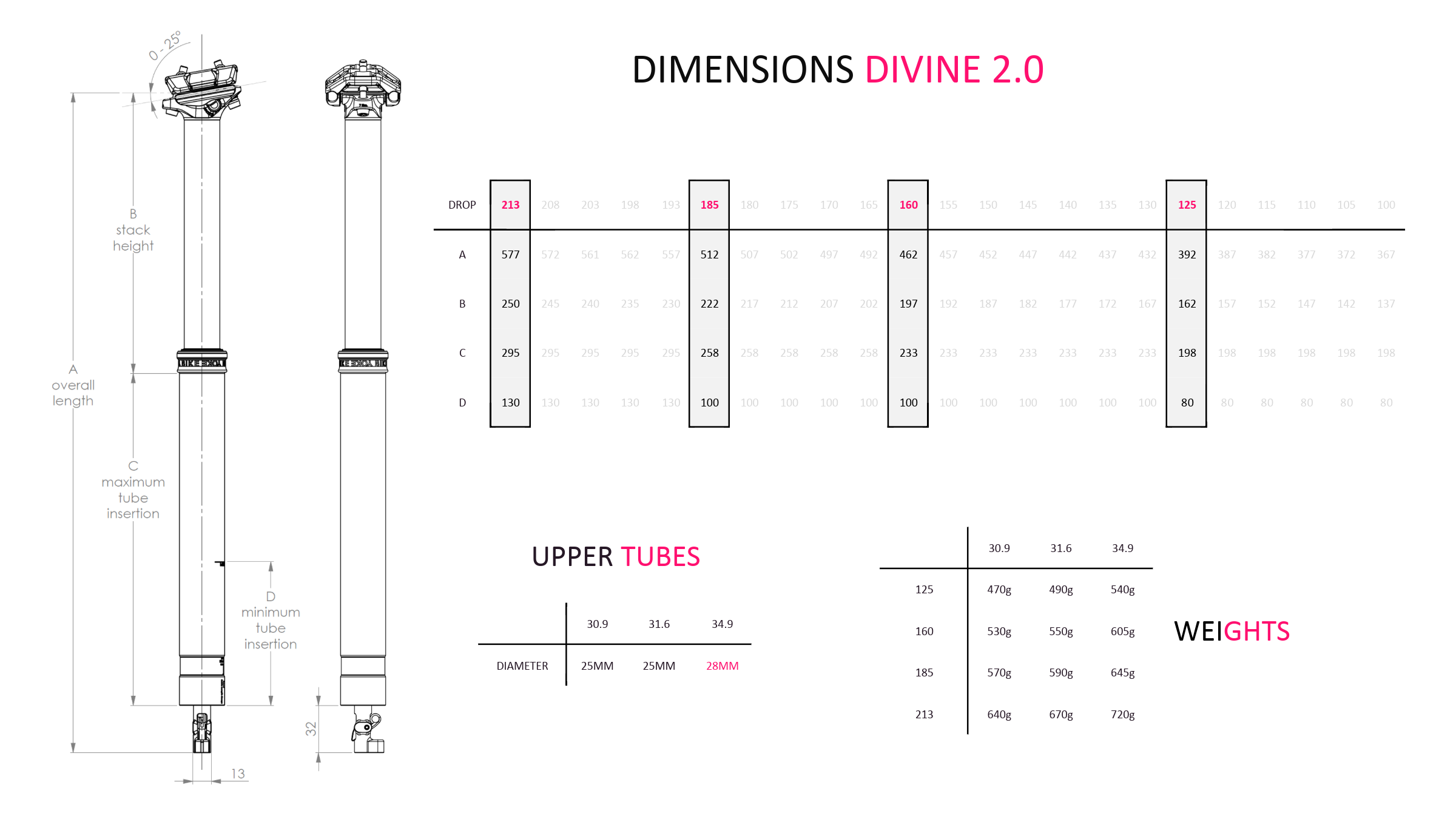 - Travel options: 125, 160, 185, and 213 mm (travel can be adjusted internally in 5 mm increments).