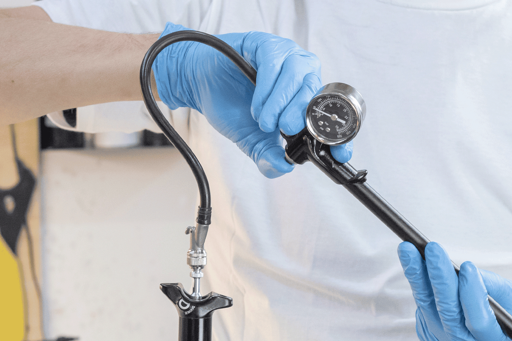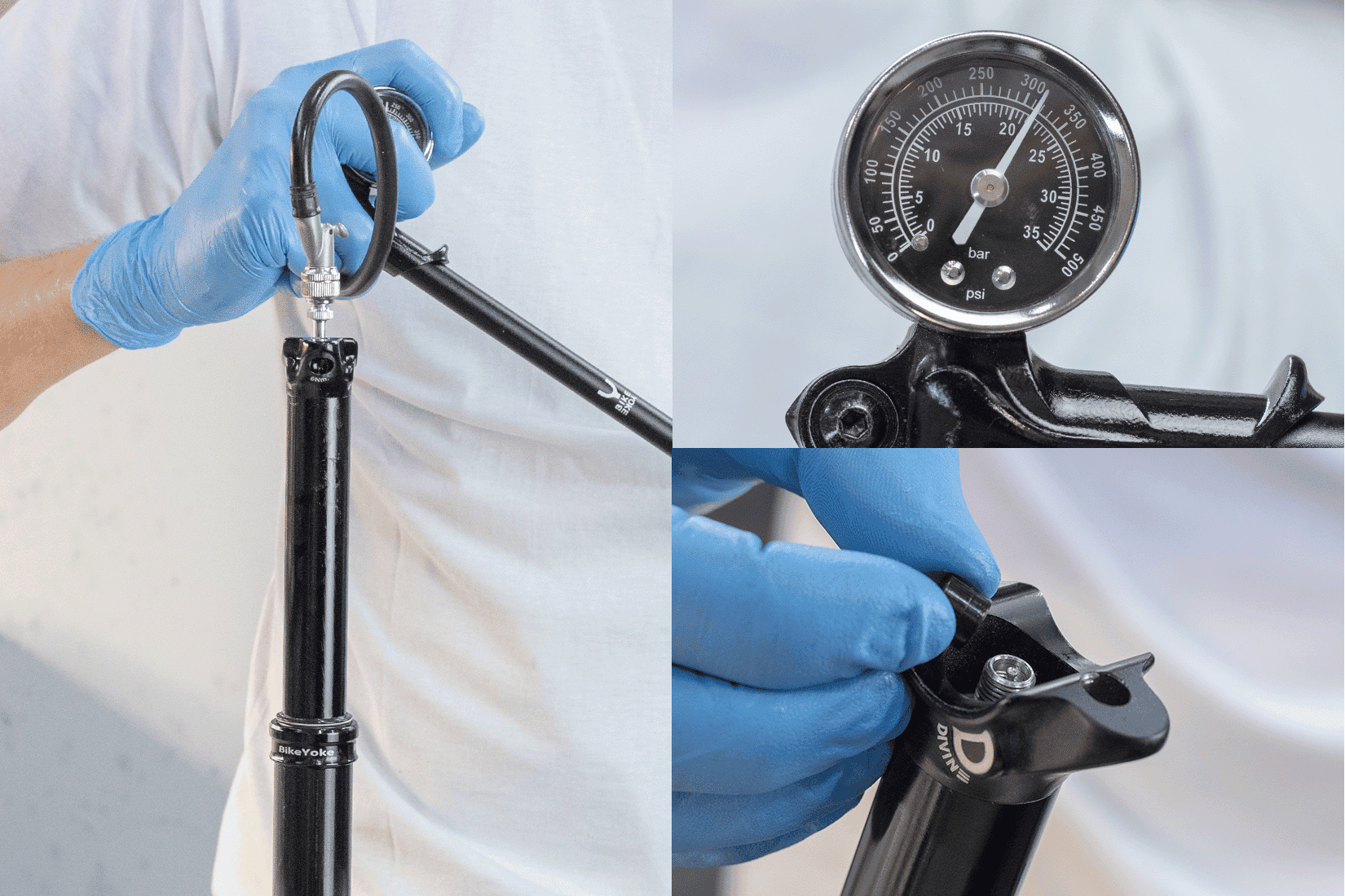 IMPORTANT: Bring the seatpost into an upright (vertical) position and fully extend it before you attach a shock pump.